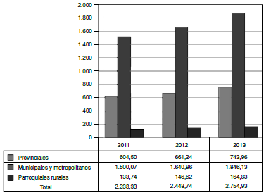 En la Figura 10 figuran los montos transferidos a las GADs durante los años 2011 a 2013, donde se aprecia que fueron en aumento año a año y también según el nivel de gobierno.