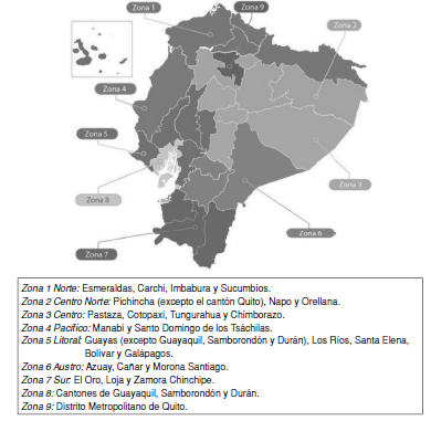 Con el fin de llevar una ordenada descentralización, la Senplades estableció niveles administrativos de Planificación, dividiendo el país en nueve Zonas 7, 140 distritos y 1.134 circuitos, donde las zonas esta conformadas por provincias contiguas y están constituidas por distritos y los distritos a su vez por circuitos.