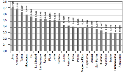 La siguiente figura (12) muestra el Índice de competitividad regional en el Perú, donde además de advertir que Lima es la más competitiva, las regiones de la costa son las que presentan mayor competitividad seguidas de las regiones de la sierra y las que menos las regiones de la selva que se caracterizan por tener infraestructuras deficientes o poco desarrolladas, siendo apenas atractivas para la inversión privada.