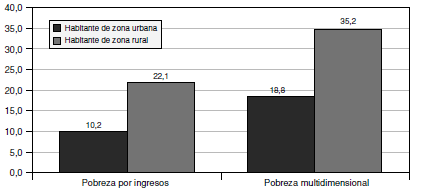 En la Figura 13, se aprecia que existe una gran brecha entre la pobreza (por ingresos o multidimensional) que existe en las zonas urbanas frente a las zonas rurales.