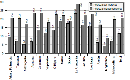 Las regiones de mayor pobreza multidimensional son La Araucania (29,29) y Atacama (26,3) mientras que La Araucania (23,6) sigue siendo la primera también en pobreza por ingresos, la región de Atacama ( 6,9) está por debajo de la media chilena.