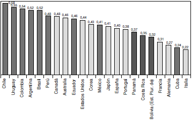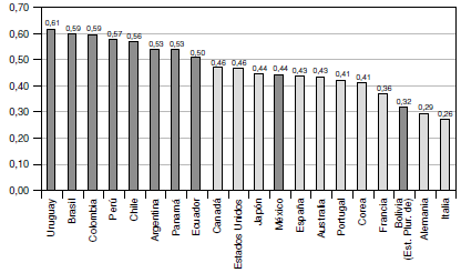 En la Figura 6 se presenta la estimación del Índice de Concentración Geográfica del PIB, donde se aprecia que la concentración geográfica de la producción es mayor que el índice de concentración geográfica de la población (véase Figura 5). Aunque en orden diferente, los países que ocupan los seis primeros puestos en ambos índices son: Chile, Uruguay, Colombia, Argentina, Brasil y Perú.