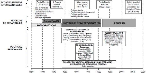 En la Figura 1, R. Correa (2016) muestra una línea de tiempo donde se relacionan los acontecimientos a nivel mundial, los modelos de desarrollo implantados en América Latina y las políticas regionales que buscaban resolver las desigualdades territoriales.