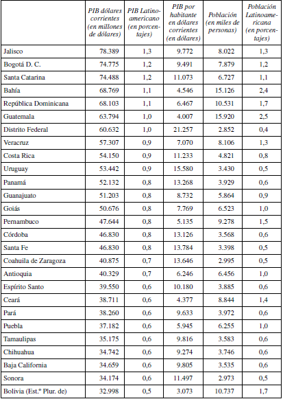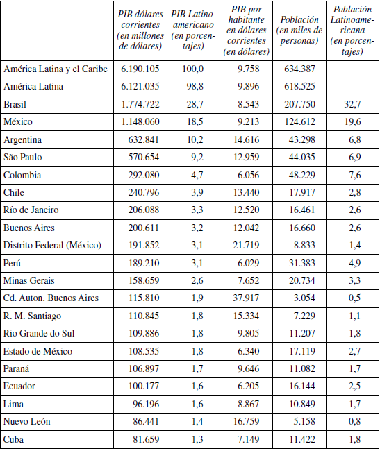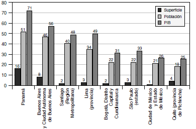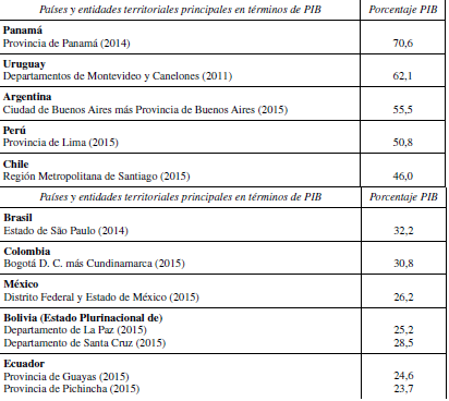 Este hecho está vinculado a la fuerte concentración que muestran bastantes países en términos de población y de producción. Con datos de 2015, en Argentina, la ciudad y la provincia de Buenos Aires concentra más del 55% de la producción del país; en Perú, la capital y su provincia suponen el 51% del total del país; en Chile, el 46% corresponde a la Capital y su provincia; en Brasil, el estado de São Paulo produce el 32,2% del total nacional; en Colombia, Bogotá y Cundinamarca proporciona el 30,8%; y en México, el Distrito Federal y el Estado de México suman el 26,2% de toda la producción mexicana.