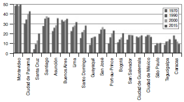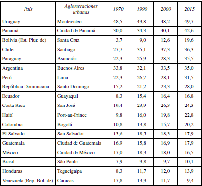 La concentración demográfica es un fenómeno poblacional que describe el peso relativo de las principales aglomeraciones con respecto a la elevada urbanización de una región. En el caso de América Latina, en los últimos años se han atenuado los fenómenos migratorios campo-ciudad en gran medida, dando paso a procesos migratorios a ciudades de menor tamaño y próximas a los orígenes de las personas que emigran (CEPAL, 2017a). Las principales aglomeraciones urbanas de los países crecen o se mantienen. Uruguay, es un ejemplo claro en el que la emigración apenas varía a lo largo del periodo. Por el contrario, el país que más baja es Venezuela que pasó del 17,8% a un 9,4% en el año 2015 y que posiblemente mantendrá esta misma línea como consecuencia de las políticas puestas en práctica.