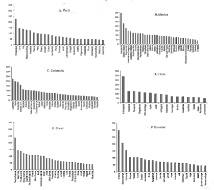 La Figura 7 recoge los resultados de la estimación del PIB por habitante de Perú, México, Colombia, Chile, Brasil y Ecuador en relación con la media del respectivo país, donde pueden observarse las fuertes diferencias que existen en los casos de México, Chile, Ecuador y Brasil.