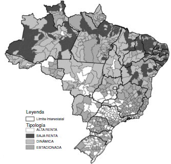 En la Figura 8 se aprecian las profundas desigualdades sociales y regionales exis tentes en Brasil, desigualdades que no se limitan a la dimensión regional, sino que dentro de los grandes estados de estas existen microrregiones con enormes diferencias entre ellas. Las tipologías en que clasifica la PNDR las microrregiones son: a) renta alta: pertenecen por lo general a las regiones del Sur y Sureste y en las capitales de los estados representan el 76% del PIB nacional y el 53,7% de la población, teniendo un patrón consolidado de competitividad; b) dinámica: microrregiones con dinamismo creciente o emergente en los últimos años, se concentran principalmente en el Centro-Oeste o Noreste corresponden al 9% de la población y representan el 4% del PIB nacional; c) estacionada: estas microrregiones están repartidas por todas las grandes regiones, representan el 29% de la población y el 18% del PIB nacional, y d) baja renta: concentrados sobre todo en las regiones del Norte y Noreste de Brasil, representan el 8,4% de la población y el 1,7% del PIB brasileño.