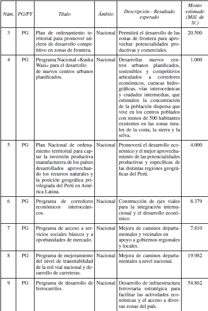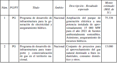 Los programas estratégicos que se establecen en el Plan Bicentenario para el desarrollo económico y de infraestructuras se muestran en el Cuadro 5 y un primer balance para el periodo 2012-2017 se muestra en el Cuadro 6: