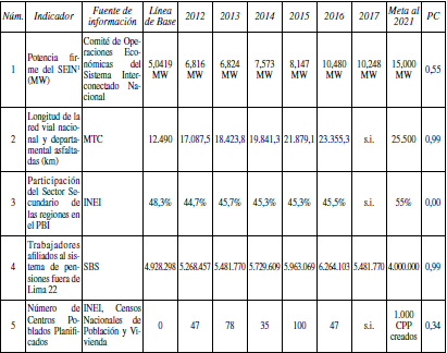 Fuente: Dirección Nacional de Seguimiento y Evaluación (DNSE) (Ceplan, 2018)Nota: s.i.: sin información.En OCDE-CEPLAN (2016), indica que el Perú es diverso en su territorio y las dinámicas de crecimiento son diferentes entre las regiones; reafirman que Lima tiene un excesivo dominio regional en comparación a los países que integran la OCDE y que las zonas rurales a pesar de que contribuyen a la economía nacional (actividades principalmente extractivas) no explotan su potencial debido a la falta de planeamiento, a deficientes infraestructuras y falta de inversión. Una de las medidas que debería tenerse en cuenta para una buena planificación sería contar con información y bases de datos actualizados a nivel de las regiones.