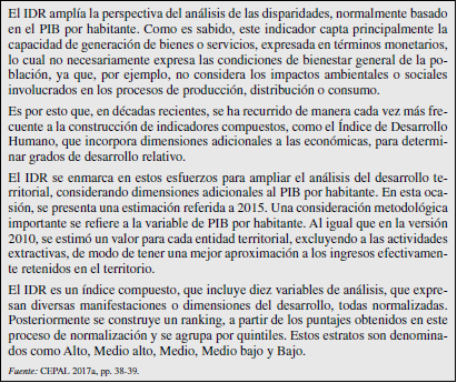 CEPAL (2015) propuso la estimación de un Índice de Desarrollo Regional cuya primera versión se presentó en el Panorama de 2015. «Dicho índice —como señala dicho documento— busca profundizar en el análisis de las desigualdades subnacionales, pero a partir de una nueva perspectiva metodológica», como se explica en el recuadro adjunto.