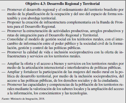 Los planes plurianuales (PPA) anteriores buscaban que Brasil tuviese un crecimiento económico con inclusión social. El PPA (2004-2017) tenía como prioridad las políticas sociales; el PPA (2008-2011) en el contexto de crisis global dio prioridad a la mantención y expansión de las inversiones en infraestructura; y el PPA (2012- 2015) tuvo como principal objetivo la erradicación de la pobreza extrema. La finalidad del PPA (2016-2019) es reforzar el compromiso en el desarrollo económico y social para reducir las desigualdades y la creación de oportunidades. Este plan tiene cuatro ejes principales: educación de calidad, inclusión social y reducción de des- igualdades, ampliación de la productividad y de la competitividad de la economía y el fortalecimiento de las instituciones. También se establecieron directrices estratégicas transversales a los ejes principales; entre ellos está «la reducción de las desigualdades regionales e interregionales y la promoción del desarrollo territorial sustentable, respetando las identidades y la diversidad cultural». La inclusión de esta directriz se debe a la PNDR que puso de manifiesto que la desigualdad debe ser tratada a diferentes escalas, de tal manera que abarquen las áreas menos desarrolladas repartidos por todo el territorio nacional.