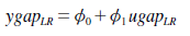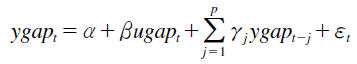(5)where ygapt is the log of the output gap, ugapt is the unemployment rate gap and εt is an error term. We allow for a lag structure in this equation, in order to capture ad-equately the dynamics of the relationship between output and unemployment gaps. As discussed below, the optimal lag structure will be determined following standard statistical information criteria.