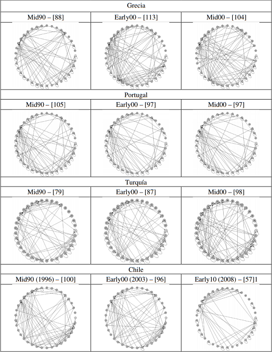 Finalmente, obtenidas las matrices con las elasticidades que modifican las respectivas producciones sectoriales en un 1%, se procede a la elaboración de las respectivas matrices Booleanas donde el valor 1 se asocia a los rij menores e igual a un 15%. Obtenidas estas matrices para cada economía, se construyen los CdI, en base a la técnica de Grafos5,6.