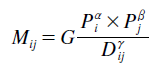 (1)in which: Mij refers to the number of people resident in area j who at an earlier point in time (usually one or five years) resided in area i; Pi (Pj) refers to the population of i (j) usually measured at the beginning of the period over which migration is measured; Dij is some measure of distance between i and j; α, β and γ are parameters to be estimated and G is a proportionality constant that is context specific (dependent on the geography, time dimension, etc.). The popularity of this simple model was undoubtedly related to the ease with which the model could be estimated by ordinary least squares after a transformation into logarithmic form: