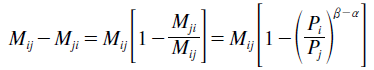Estimates of α and β vary across applications as well. In the New Zealand case, estimates of α and β are commonly between 0.8 and 0.9 (Alimi et al., 2015). The two parameters are unlikely to be identical in the migration context. Given that Dij = Dji in most applications and E(εij) = E(εji) = 0, the expected value of net migration between any origin and destination pair, E(Mji - Mij), is zero when α = β. This is rather unrealistic given that there are in most countries regions that structurally gain population through internal migration while others lose population. We can use Eq. (1) to obtain an equation for net migration as follows: