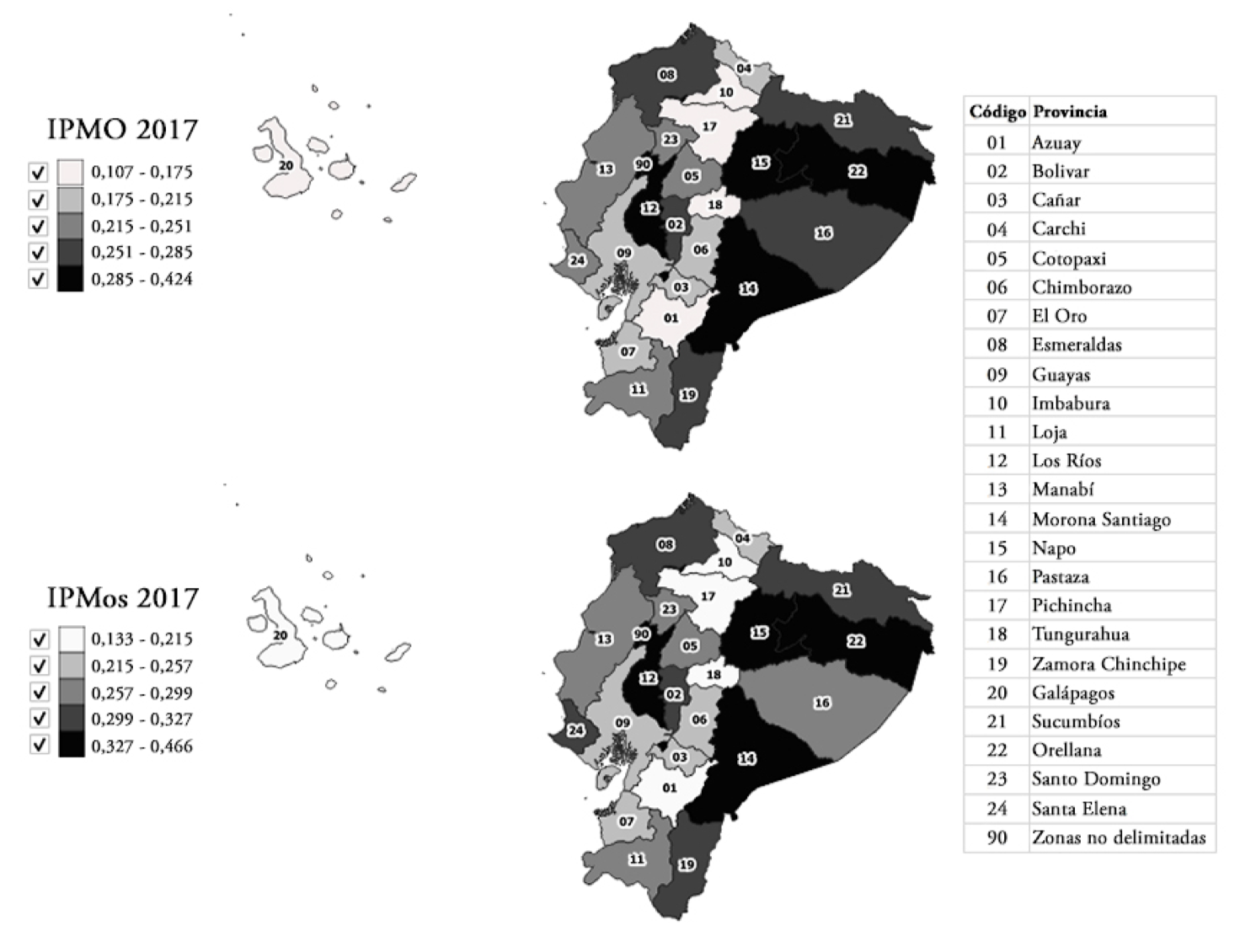 En la pobreza multidimensional a nivel regional, se considera las 24 provincias[6] del país, por ser la unidad geográfica más pequeña de la que se dispone información. Se agrupa a las provincias por niveles de pobreza (muy alto, alto, medio, bajo y muy bajo) en función de los cuartiles del valor del IPMo y el IPMos. Los resultados se presentan en el mapa provincial de Ecuador, lo cual permite identificar como incide la inclusión de la dimensión bienestar subjetivo en los niveles de pobreza a nivel provincial.