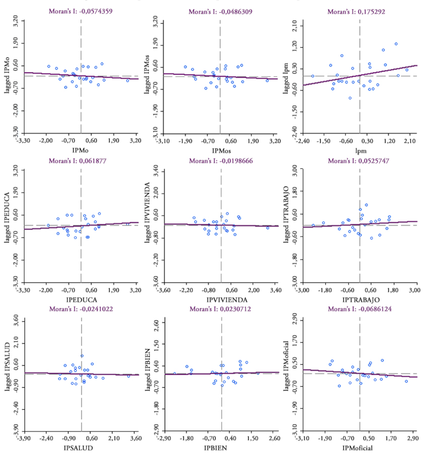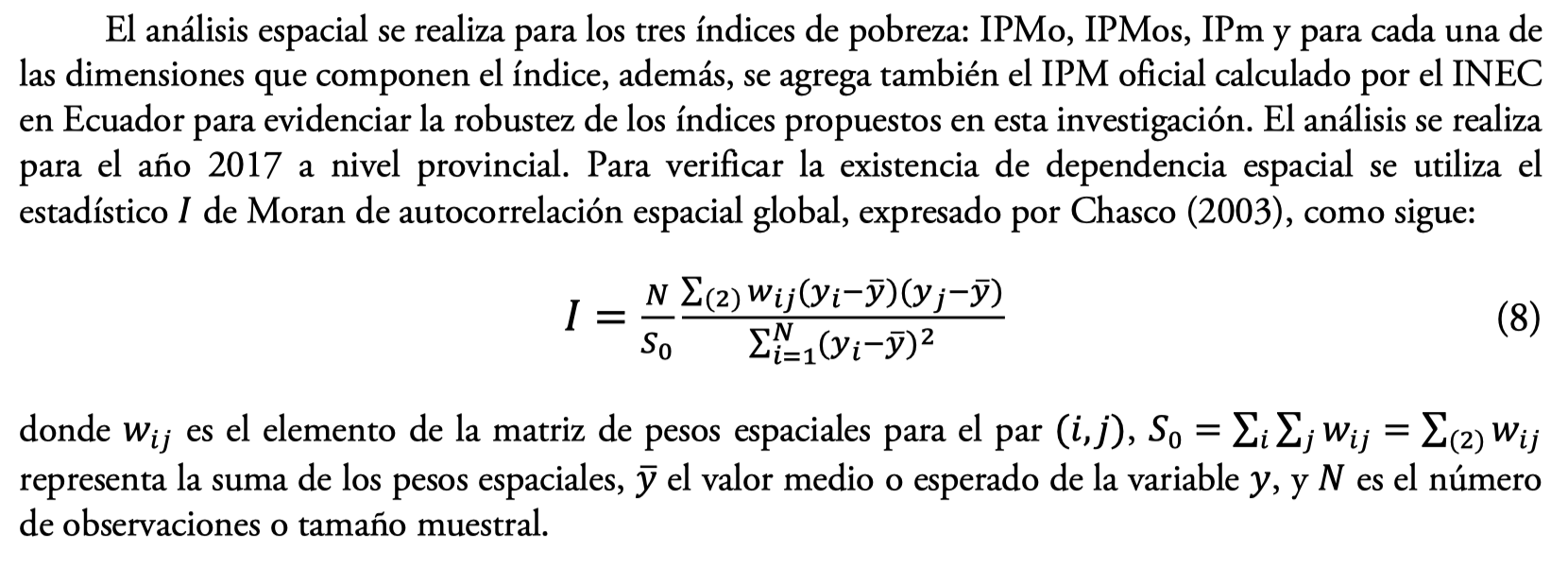 y no son significativos, es decir, que la pobreza multidimensional de una provincia no depende o no está relacionada con la pobreza multidimensional de sus provincias vecinas, esto refleja la heterogeneidad de las provincias ecuatorianas, puesto que, el IPMo, el IPMos y el IPM oficial se construyen con un gran número de indicadores de privación. Sin embargo, el IPm si evidencia la existencia de autocorrelación espacial (baja) positiva y significativa[8], por lo que, se puede inferir que provincias con altos índices (bajos) de pobreza monetaria, son vecinas de provincias con altos (bajos) índices de pobreza monetaria (ver gráfico 2).