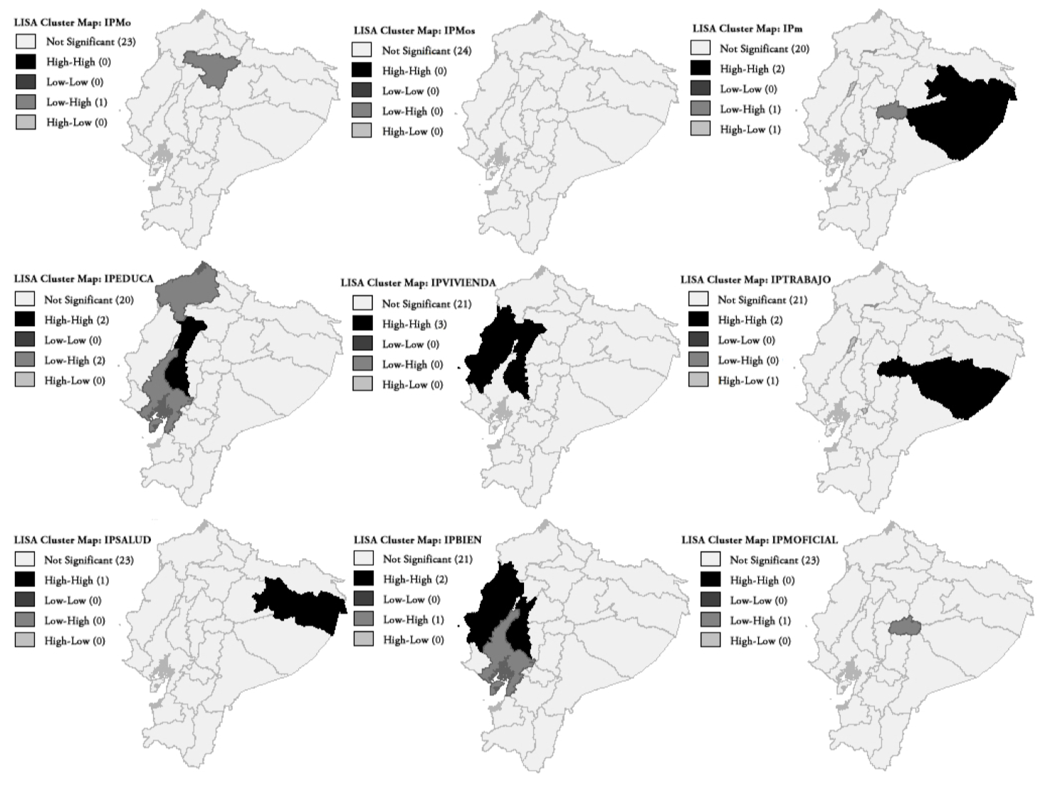 En cuanto a las dimensiones de la pobreza: educación, vivienda y entorno, salud y alimentación, trabajo y bienestar subjetivo; se identifica la presencia de diferentes tipos de clústeres, sin embargo, son las provincias de Los Ríos, Santo Domingo, Manabí, Pastaza, Orellana y Tungurahua las que concentran mayores privaciones (High-High) en las dimensiones de la pobreza multidimensional, esto permite identificar las zonas que requieren priorización de políticas públicas en función de los recursos limitados que posee el país.