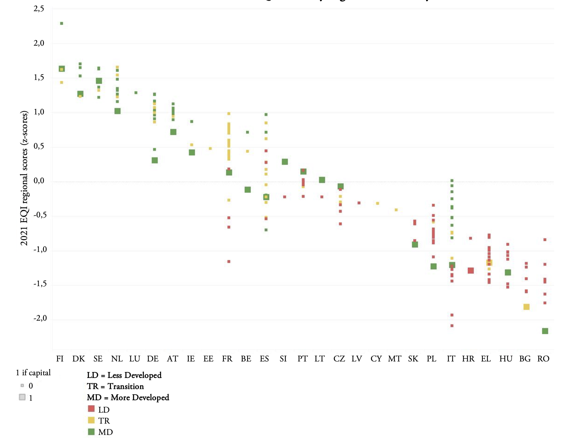 Figure 2 shows the distribution of regional scores by country (countries reordered according to their national value from the best performers, left-hand side, to the worst performer, right-hand side). Regions are displayed in three categories – from less developed to more developed passing through the transition category - according to their GDP per capita. These categories represent the region’s eligibility criterion for EU cohesion policy funding, in particular for the European Regional Development Fund and the European Social Fund both highly relevant in the context of regional investment for jobs and growth. The lower the region’s level of development, the higher the share of European investment funds the regions is eligible to receive. Overall, more developed regions are also those showing the highest levels of EQI, both within and within countries, as can be seen by the prevalence of green and yellow in the left-hand side of the figure.
