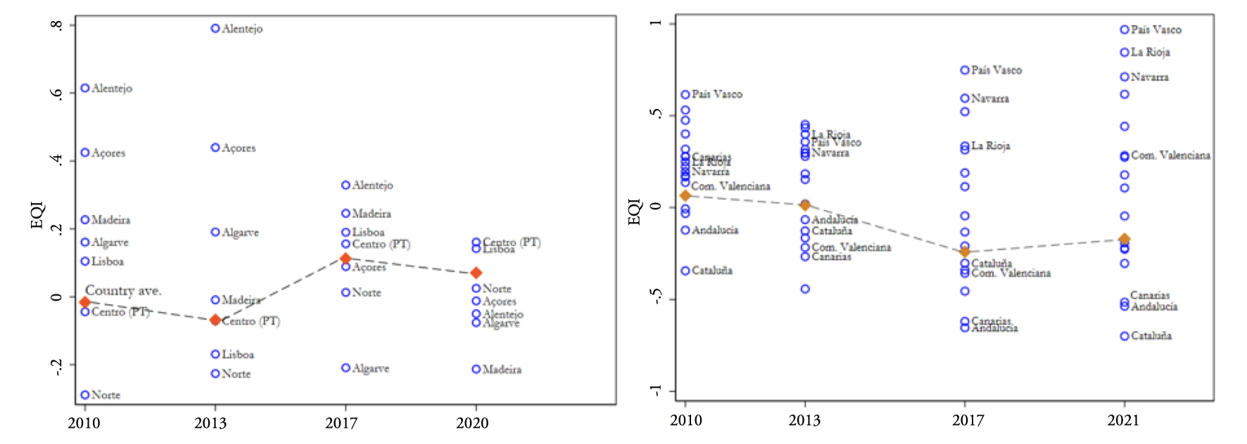 Note: blues circles show regional EQI estimates in Portugal (left) and Spain (right), and red diamond is the population weighted country average of the regional EQI by year. Select regions are noted in Spain.