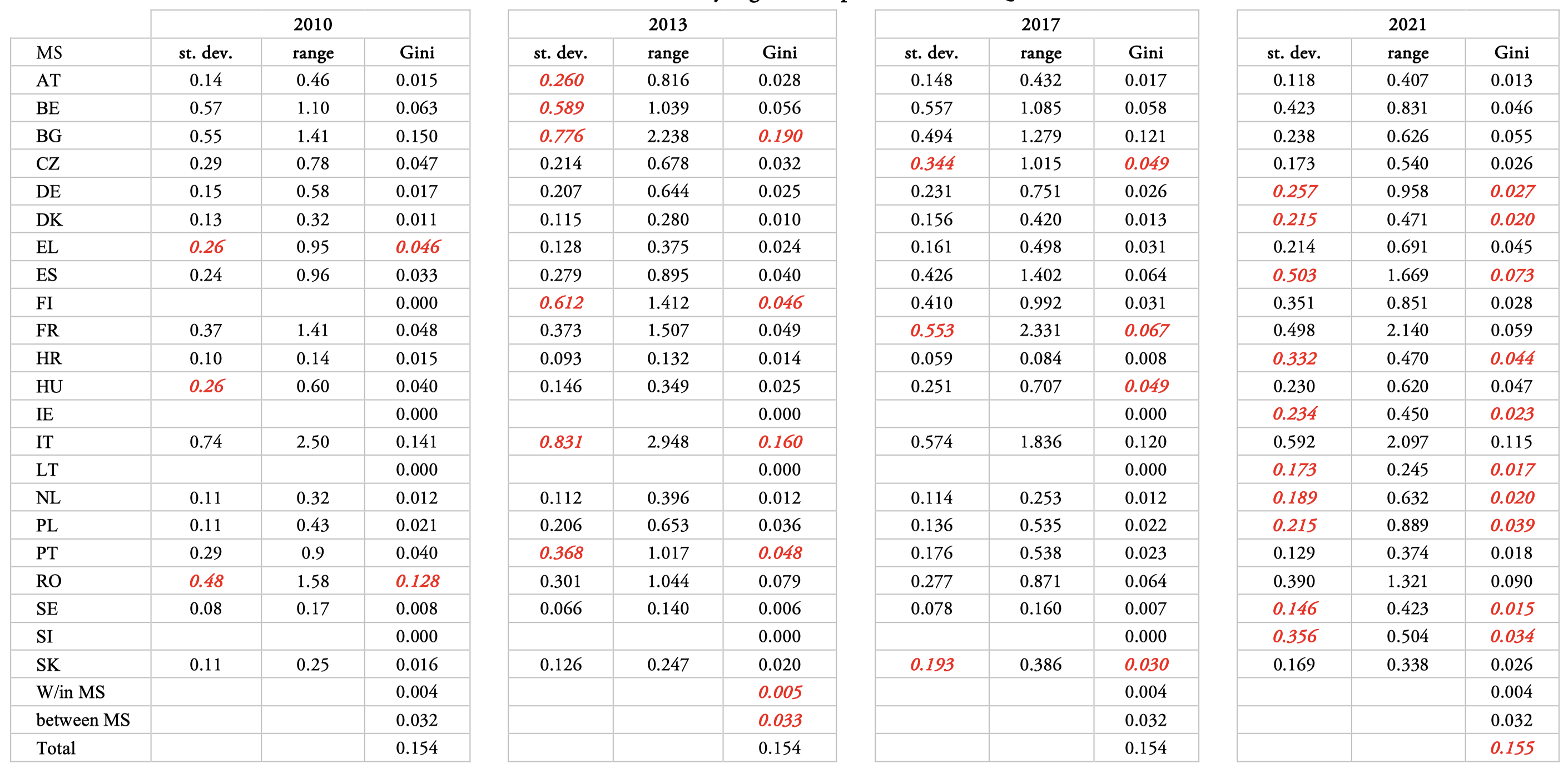 Note: ‘st. dev.’ is the unweighted standard deviation of regional EQI scores within the noted country for the given year. ‘Range’ is the absolute difference in max-min regional score within a country. ‘Gini’ is the Gini coefficient of the re-scored EQI index via ‘ineqdec0’ (Jenkins 2008), whereby we add the absolute value of the most negative observation to avoid negative integers dropping ‘0’ values. Finland, Croatia and Ireland not included in 2010. Ireland’s previous NUTS level regional dispersion from the 2013 and 2017 years discontinued due to NUTS 2 reform between 2017 and 2021. Cyprus, Estonia, Latvia, Luxembourg and Malta not included, due to no years with multiple NIUTS 2 regions. Each country’s highest year of dispersion rate according to st. dev. is highlighted in red.
