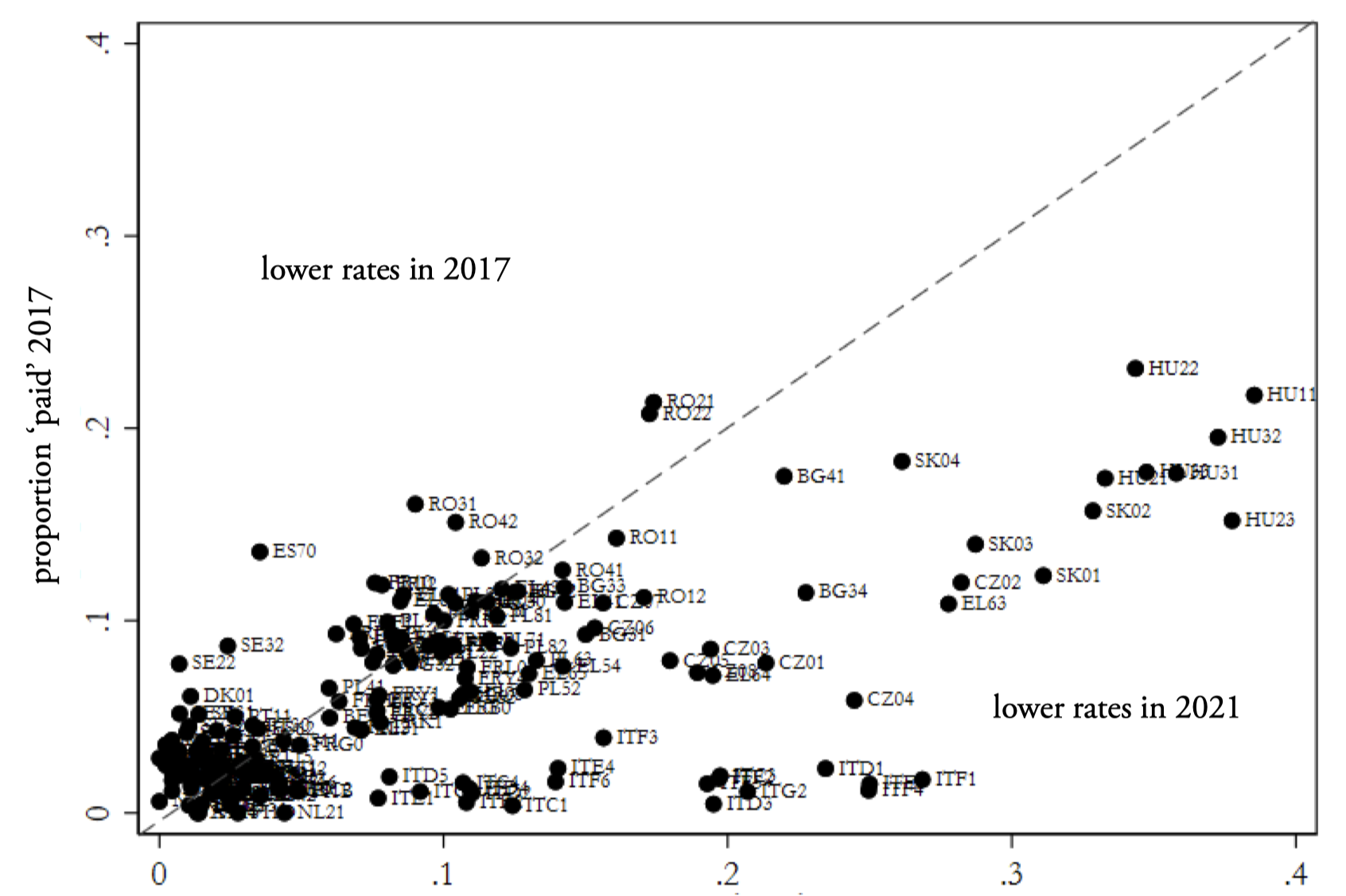 First, we would expect that given the lock-downs, school closures, and restricted access to non-essential services in many areas in the EU, that rates of experiences with petty corruption would go down. Figure 5 shows the relationship between regional rates of petty corruption experiences (proportion ‘yes’) in 2017 and 2021[16]. The figure demonstrates that in most cases (70% of the regions) the rates of personal experience with petty corruption in any of our inquired services was lower in 2021 than in 2017. The overall average dropped from 9.3% in 2017 to 6.1% in 2021[17]. In particular, remarkable decreases are observed in Italian regions, as well as in Czech Republic, Slovakia, Hungary and Bulgaria. However, in some cases, such as in several Romanian regions among others, we find that petty corruption has in fact increased. The most notable case in this instance is the Canary Islands (ES70) in Spain, which increased from 3.5% to 13.6% (p<0.001)[18]. The island region was hit especially hard economically by strict tourism restrictions[19], which likely created significant pressure on the health care system and shortages of goods and services, increasing incentives for informal exchanges (Rose 2015). While this simple analysis does not allow to assess any causal effect per se, the pattern observed suggests that during the pandemic there was a sizeable decline of experiences with petty corruption, as we would anticipate in a pandemic as such.