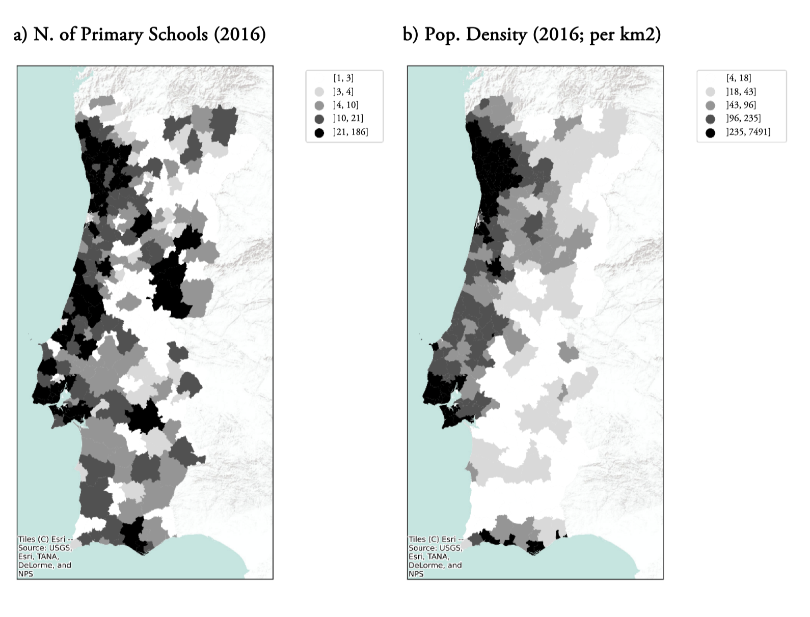 Accordingly, this article considers the variation in the number of primary schools as a function of the number of students and other explanatory variables, taking into consideration the different factors considered relevant in the literature for explaining the provision of primary schools at the local scale. These variables include population density, as an indicator for the type of settlement, the income of the employed, as indicators of the economic status, and fertility, migrations, and employment, as indicators for locations’ attractiveness and general growth perspectives (as was noted by Marques, Tufail, et al., 2021, territories with higher migration and fertility rates tend to have more positive evolutions in the number of schools).