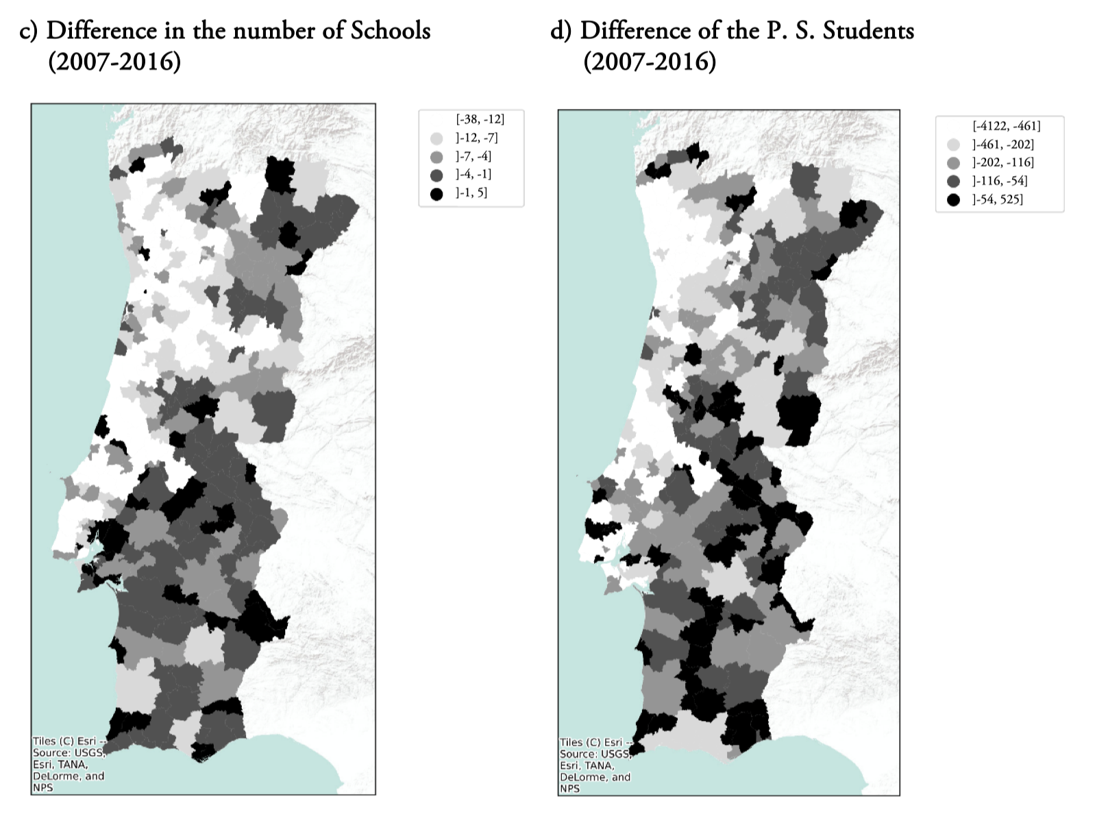 In Figure 1 it is possible to observe that, in the considered period, the main trend is for primary school closures to largely exceed the opening of new schools and, also, that the municipalities which witness a sharper decrease in the number of primary schools tend to be located in the coastal regions in the North and Centre of the country (Figure 1C). On the other hand, there still is a positive trend in the number of Primary Schools in some municipalities in the centre of Portugal.