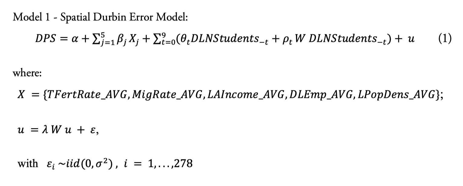 Drawing on previous work relating to the way the number of schools is adjusted to the number of students at the local scale (Cordeiro et al., 2014; Marques, Tufail, et al., 2021), this article contributes to understanding the time lag of this adjustment, as well as the different factors and territorial contexts that are relevant for this relationship, through a spatio-temporal and a cross-section spatial error model.