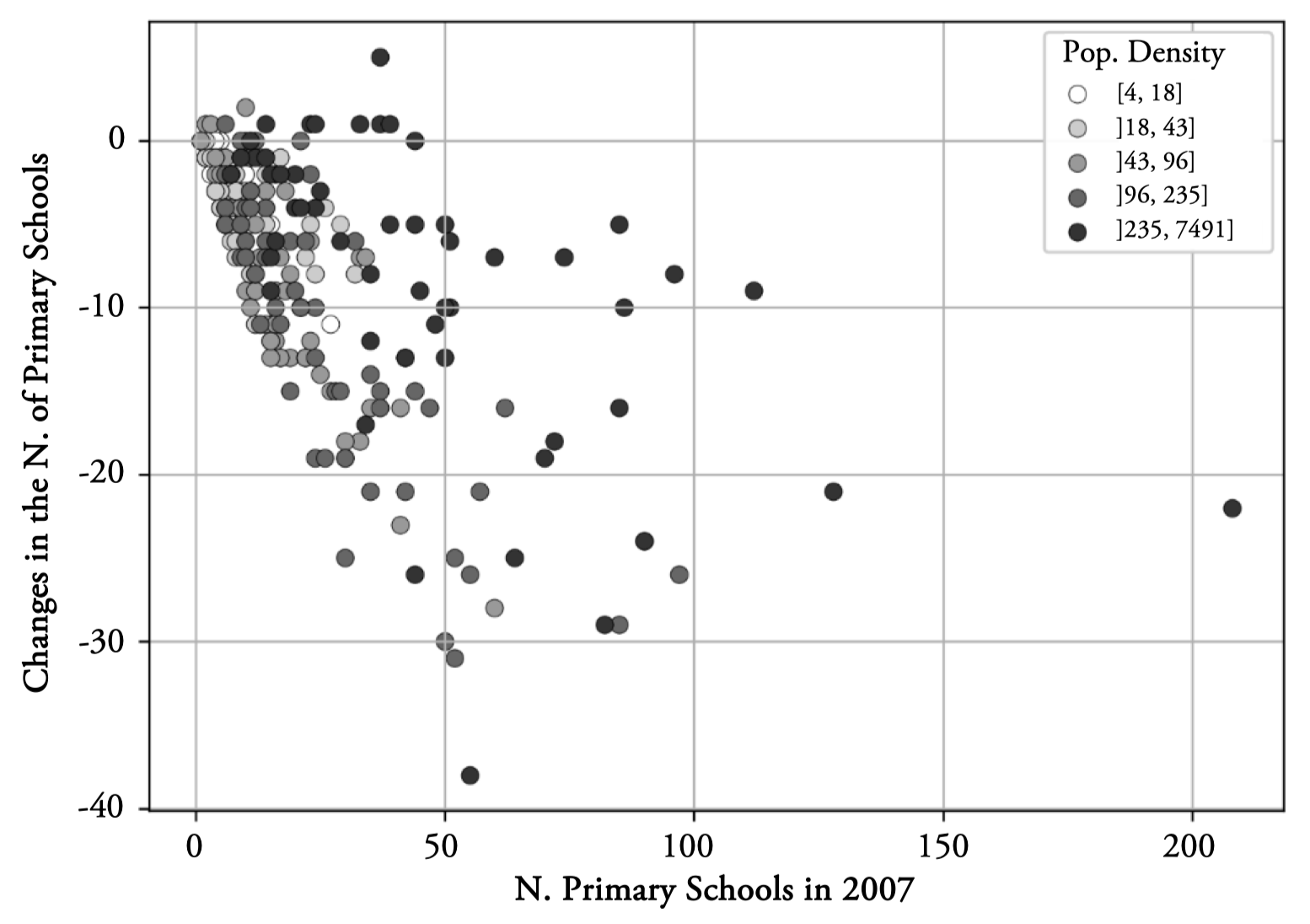 But most importantly, and counterintuitively, the evolution of the number of students and the average population density have no statistically significant relationship with changes in the number of schools (as was noted, low-density, remote, municipalities would be expected to be subject to more school closures). The most plausible explanation for these findings is that in many municipalities the lower threshold of service provision is being approached, considering the many years of school consolidation and the legal obligation to provide this service at a reasonable distance. In other words, some municipalities with very negative values in the number of students cannot close more schools, and most of the more recent consolidation is occurring in municipalities with a higher number of schools. This assumption seems to be confirmed by Figure 2, which shows a negative correlation between the number of primary schools in a municipality, and the evolution of the number of primary schools.