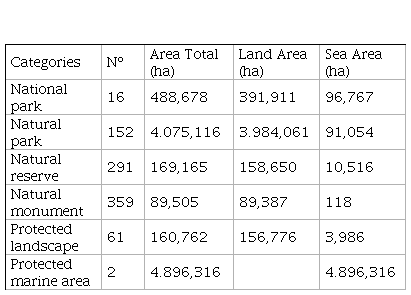 Surface area and number of protected natural spaces under the figures established in the State Law (42/2007) - Spain