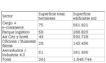La superficie total edificable es de 1.848.744 m2 (información proporcionada por AENA a los autores), recogiéndose en el cuadro 1 el uso sectorial previsto de dicha superficie. La planificación de AENA contempla la entrada en el mercado de dicho suelo en varias fases, a lo largo de un total de veinte años. La inversión directa realizada por AENA sería de 173,2 millones de euros, consistente básicamente en la urbanización y adecuación de los terrenos y en la construcción de viales. El resto de la inversión, hasta llegar a los 1.300 millones de euros previstos, la realizarían las empresas que se instalen en dichos terrenos.