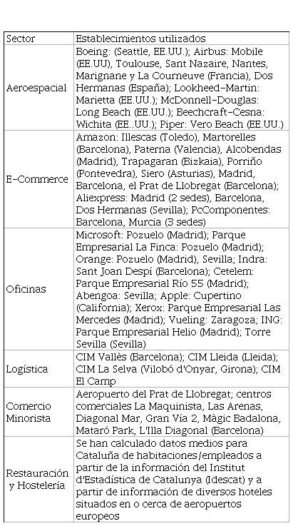 Tomando como punto de partida el Cuadro 1, que nos indica las tipologías de empresas que se instalarían en el Aeropuerto y la superficie destinada a cada una de ellas, se necesita, a partir de dichos valores de superficie utilizada, estimar el output (facturación) de dichas empresas. Para ello, tomando como base a Artís et al. (2009), se ha procedido en primer lugar a obtener información sobre el número de trabajadores por unidad de superficie y tipología de actividad, para poder calcular la ratio de metros cuadrados por trabajador. Para cada uno de los usos previstos del desarrollo de la Ciudad Aeroportuaria, se ha buscado información de superficie (en metros cuadrados) y de números de trabajadores de establecimientos comparables. Para las actividades específicamente aeronáuticas, estos establecimientos se han tomado de Estados Unidos y de diversos países de la Unión Europea (incluida España). En el resto de sectores, se han considerado exclusivamente empresas, establecimientos, edificios y operaciones urbanísticas españolas. El Cuadro 2 muestra los establecimientos seleccionados para cada uso de la ciudad aeroportuaria.