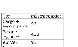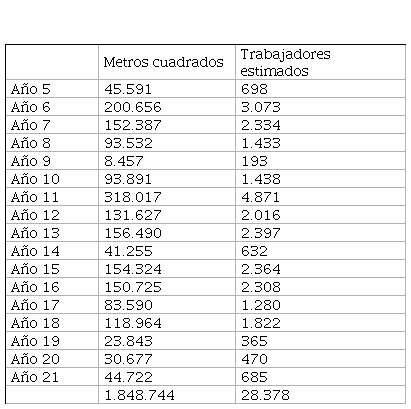 A partir de dichos datos, se ha calculado una ratio media de metros cuadrados por trabajador para cada uno de los usos previstos del terreno. A continuación, se ha calculado el número de trabajadores estimado para cada uso, dividiendo el total de metros cuadrados destinado a dicho uso en el proyecto de la Ciudad Aeroportuaria por la ratio de metros cuadrados por trabajador correspondiente. De esta manera, se obtendría el número de trabajadores estimado para cada uno de los usos cuando todo el complejo estuviese funcionando al 100%. Las ratios de metros cuadrados/trabajador utilizadas se muestran en el Cuadro 3.