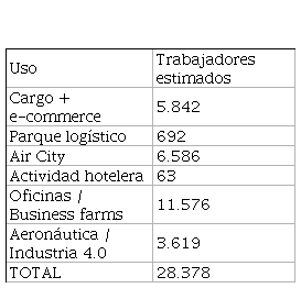 Dividiendo la superficie total dedicada a cada uso (Cuadro 1) entre las ratios medias de metros cuadrados por trabajador estimados en el Cuadro 3, obtenemos el número total de trabajadores estimado para cada uno de los tipos de empresa (Cuadro 4)[13]. De esta manera, se estima que, operando a pleno rendimiento, la Ciudad Aeroportuaria generaría un total de 28.378 ocupados.