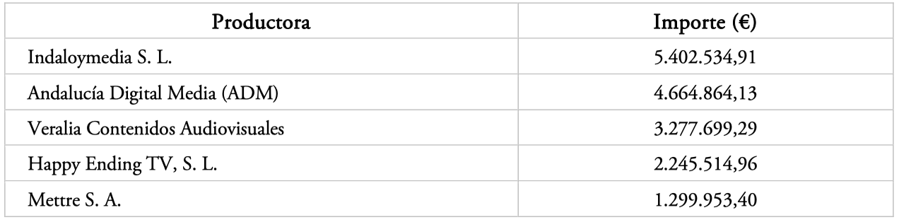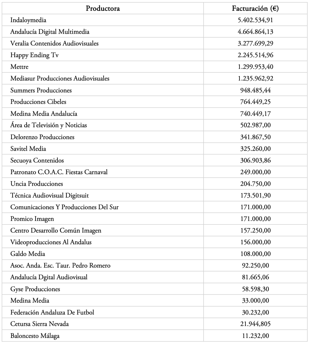 A fin de este estudio (noviembre de 2022), cinco empresas recibieron más del 50% del total. Indaloymedia, Andalucía Digital Multimedia (ADM), Veralia Contenidos Audiovisuales, Happy Ending y Mettre, generando la mayor facturación. Sin embargo, y aunque destaquen estas cinco, se han contratado en total los servicios de 30 empresas productoras a través de producción financiada: Eurosport; Cetursa Sierra Nevada; Federación Andaluza de Fútbol; Centro Desarrollo Común, Imagen; Baloncesto Málaga; Asociación Andaluza Escuela Tauromaquia Pedro Romero, Videoproducciones Al Andalus; Comunicaciones y Producciones del Sur; Patronato C.O.A.C. Fiestas del Carnaval; Área de Televisión y Noticias; R. P. M. Racing; De Lorenzo Producciones; Galdo Producciones; Uncia Producciones; Andalucía Digital Audiovisual; Producciones Cibeles; Promico Imagen; Medina Media; Summers Producciones; Secuoya Contenidos; Savitel Media y Mediasur Producciones Audiovisuales.