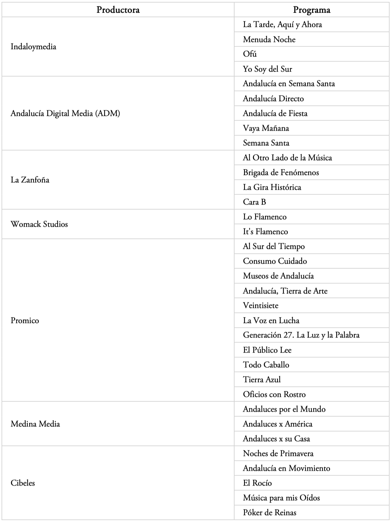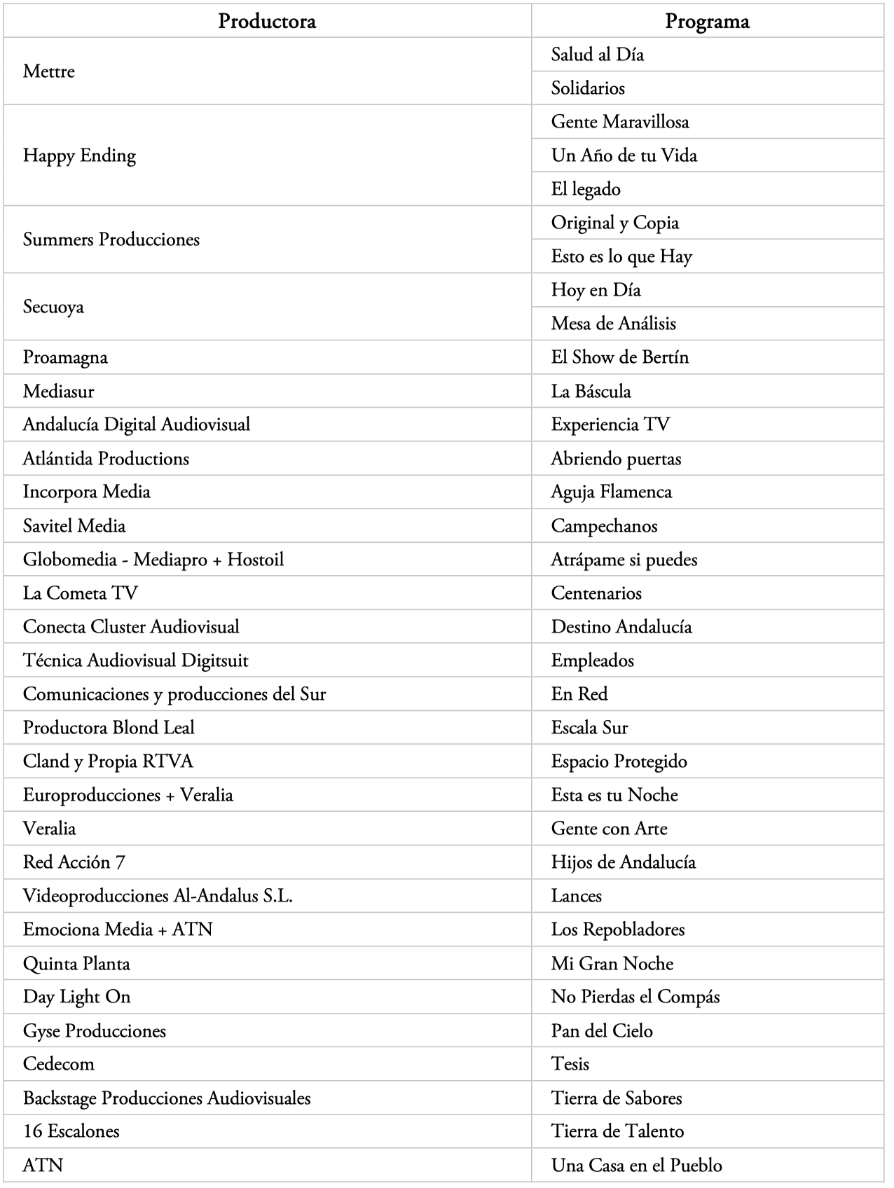 Planteábamos como uno de los objetivos el conocimiento del tejido audiovisual andaluz, desde una óptica del actual conglomerado de productoras y producciones televisivas andaluzas y en Andalucía. En este sentido, se ha trazado un mapa, en términos de tablas, nombres, programas y facturaciones, que resultan reveladores para conocer la televisión pública y privada que se hace en y para Andalucía. En este sentido, no solo se han expuesto los datos, sino que, además, se ha observado la evolución del sector audiovisual televisivo en Andalucía, ubicando elementos fundamentales para el conocimiento de la esfera empresarial y mediática.