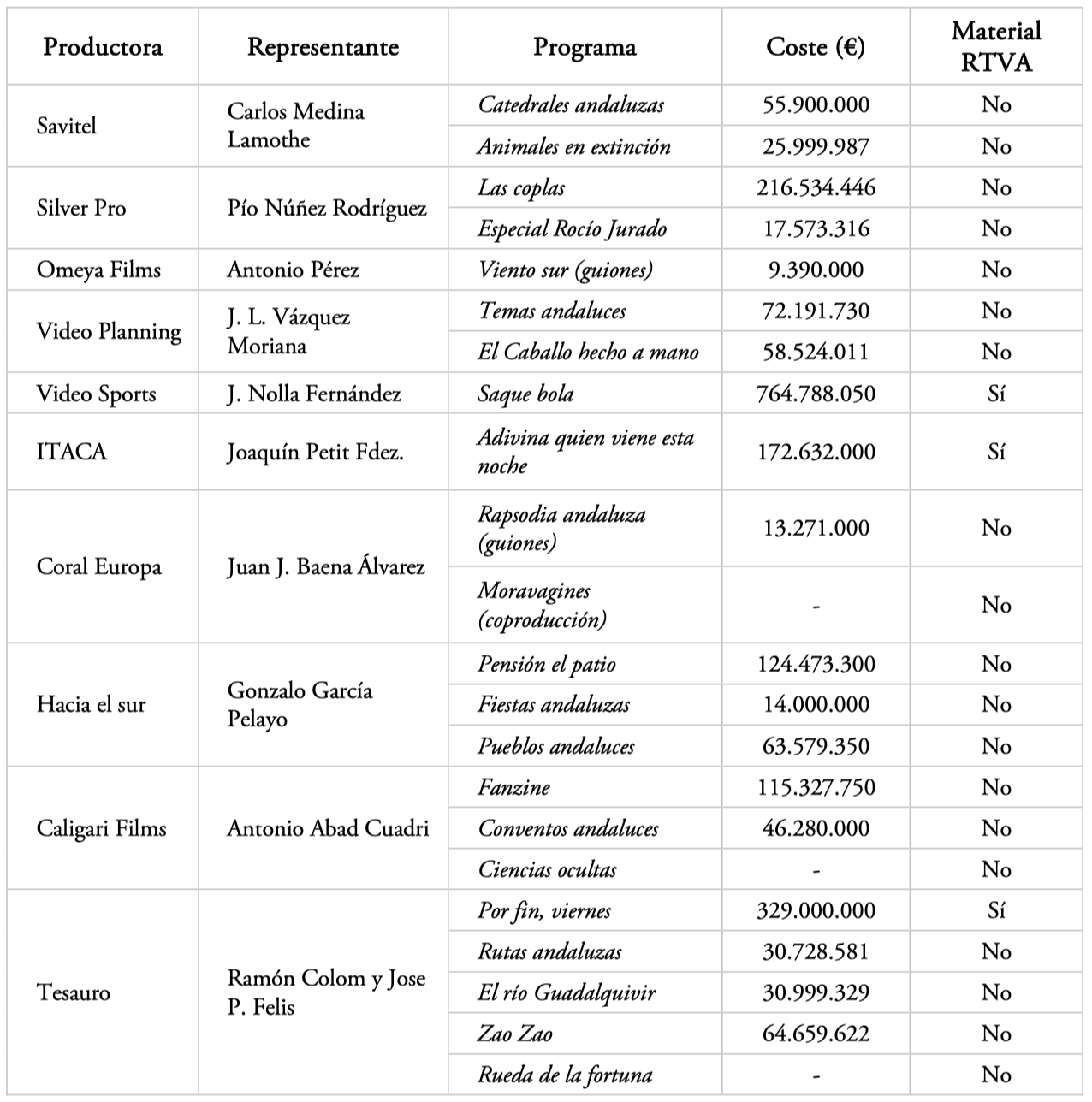 A pesar de este supuesto desarrollo del audiovisual, es en este momento cuando se pone más en entredicho la equidad de la televisión pública andaluza en su papel de potenciación del tejido audiovisual. Así, una investigación realizada por El Mundo (Rodríguez, 2018), arrojaba datos concretos sobre las empresas suministradoras de CSTV que acrecienta esa imagen de la existencia de ‘productoras élite’ que se estaban viendo beneficiadas. Según los datos públicos, doce productoras habían recibido adjudicaciones de CSTV Sur por valor de más de 53 millones de euros entre 1999 y 2004. Esta cantidad representaba el 43% del presupuesto destinado por la televisión pública andaluza a las productoras. Los datos habían sido extraídos de las fichas oficiales aportadas por la propia RTVA al Consejo de Administración. La mayoría de los periodistas entrevistados coinciden en que las informaciones que se hacían públicas en ese momento a través de los medios solían provenir de personas de la oposición política. En dichos documentos se señala que 12 productoras habían recibido algo más 53 millones de euros en 6 años. Y, aunque en estos años (1999-2004) CSTV hizo contratos con hasta 42 productoras que recibieron 125 millones de euros, las cifras exactas muestran que el 62% de la inversión en producción externas por parte de la RTVA fueron a parar a estas productoras élite, a las ‘pata negra’ (Rodríguez, 2018).