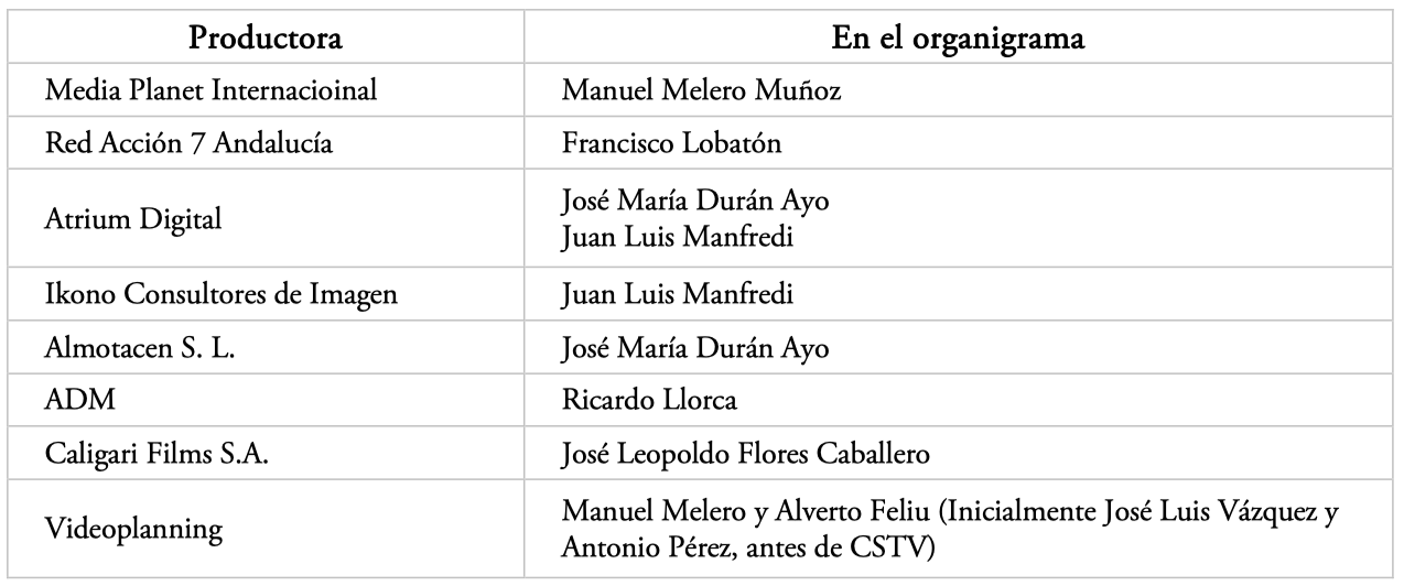 Un dato relevante que ya se debe señalar es que algunas de estas empresas pertenecen a grandes grupos de comunicación, que reaccionaron al ver que se gestaba la televisión pública andaluza, por lo que encontraron un nicho de mercado. La estructura de información y poder nunca ha estado al margen del audiovisual andaluz. Fernández-Quijada (2009) ya apuntaba dos casos concretos: Linze, la única con sede en Granada, filial del conglomerado holandés Endemol, que también operaba en España con dos de las productoras más grandes del país (Gestmusic-Endemol y Zeppelin Television, además de Diagonal Televisió). Linze era la productora de Arrayán y La noche de Arrayán para CSTV, dos contenidos, que, aunque ya hayan desaparecido, han sido referencia en la parrilla de la televisión pública andaluza. En segundo término, el grupo Mediapro tenía presencia a través de su filial Media Sur, que produjo Almería olímpica en 2004 y 2005 y dos temporadas de Bienvenidos.