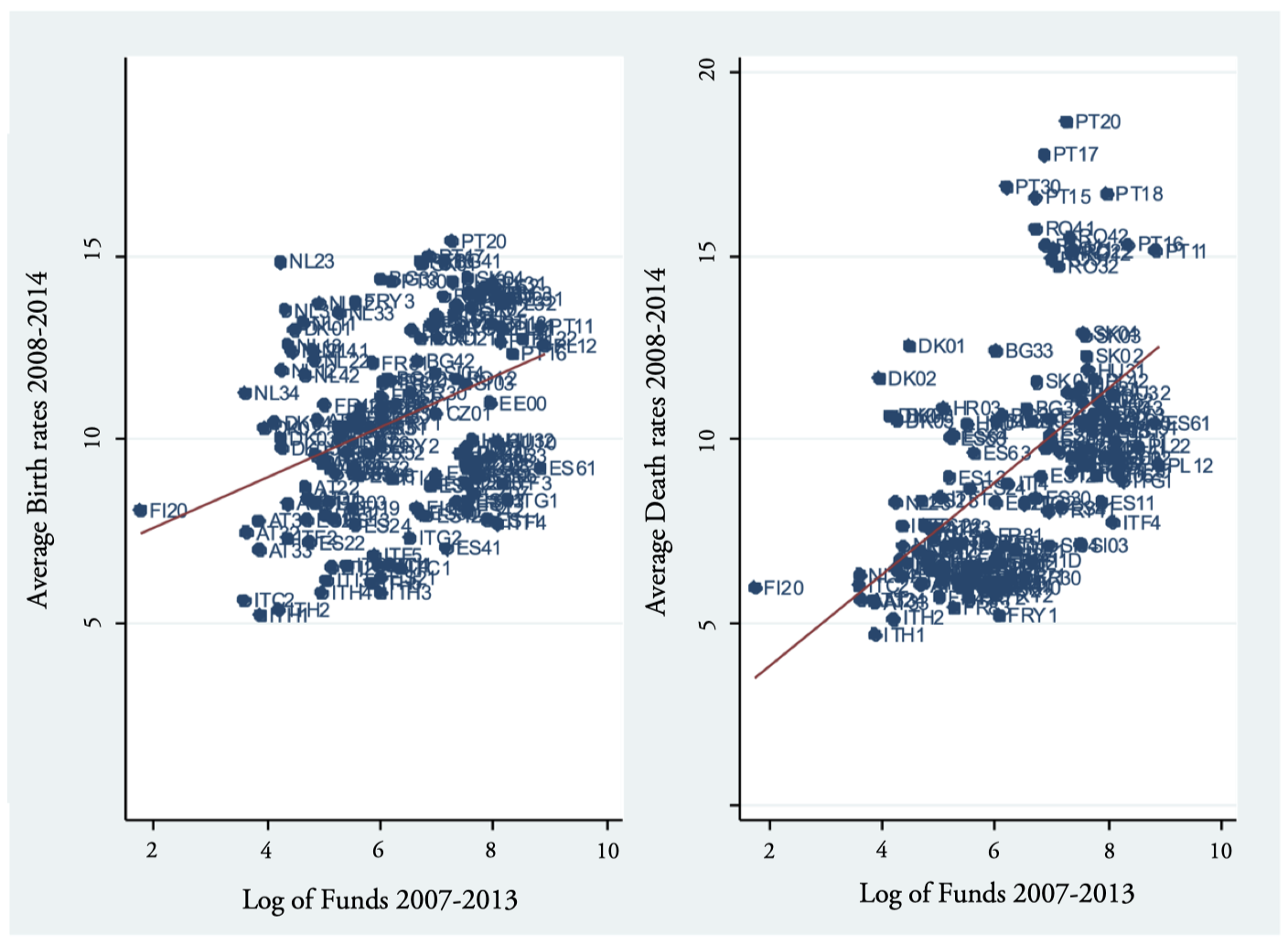 This section starts by checking whether, across European regions, there is a significant association between the (log of the) amount of funds a region spends and its firm dynamics. Figure 1shows clear positive correlations, which holds both with births and deaths rates of firms.
