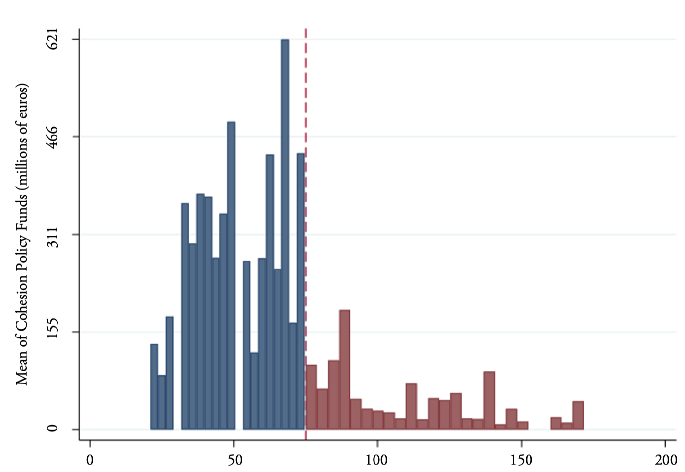 Having a GDP per capita larger than 75% of the EU (i.e., non-eligibility for EU objective 1 funding) does not imply that regions do not receive any EU regional transfer at all (as can be observed in Figure 3). Considering this imperfect compliance in the allocation of funds, we employ a “fuzzy” regression discontinuity design instead of a “sharp” RDD. While the sharp RDD exploits the discontinuity rule to identify the treatment and control groups in a deterministic manner, the fuzzy RDD employs the discontinuity rule to predict the probability of being treated, thus becoming an instrumental variable for treatment status (Angrist and Pischke, 2009).