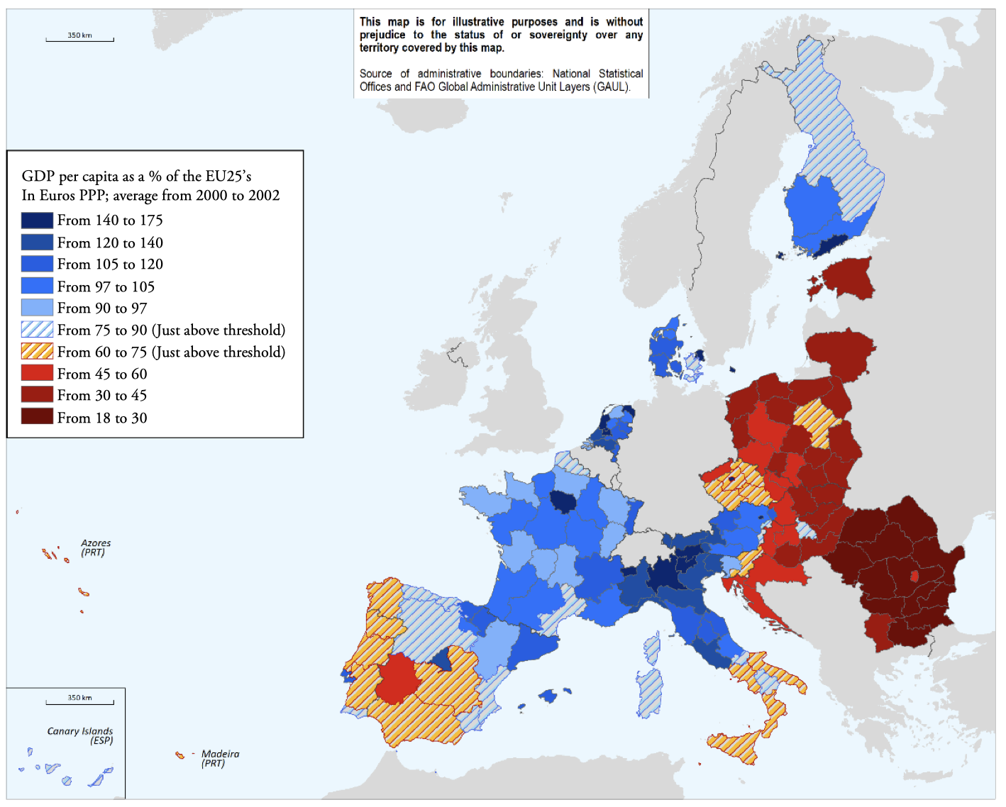 Because of the political relevance and economic magnitude of the EU Cohesion Policy, many studies have investigated the impact of these funds on recipient regions and the EU overall. Most of the literature has focused on two questions: (i) Have transfers induced economic improvements in recipient regions? (e.g., in employment, see Giua, 2017; or in accessibility and patents, see Ferrara et al., 2017), and (ii) Have transfers enabled less developed regions to catch-up with the most developed ones through higher growth rates (i.e. contributed to regional convergence)? One of the main EU’s funding allocation rules requires being under a given threshold in the level of a region’s GDP per capita relative to the GDP per capita of the EU.[1] Such a rule has been used to address the above questions from an empirical point of view, including in the study by Becker et al. (2010), one of the most known in the literature.