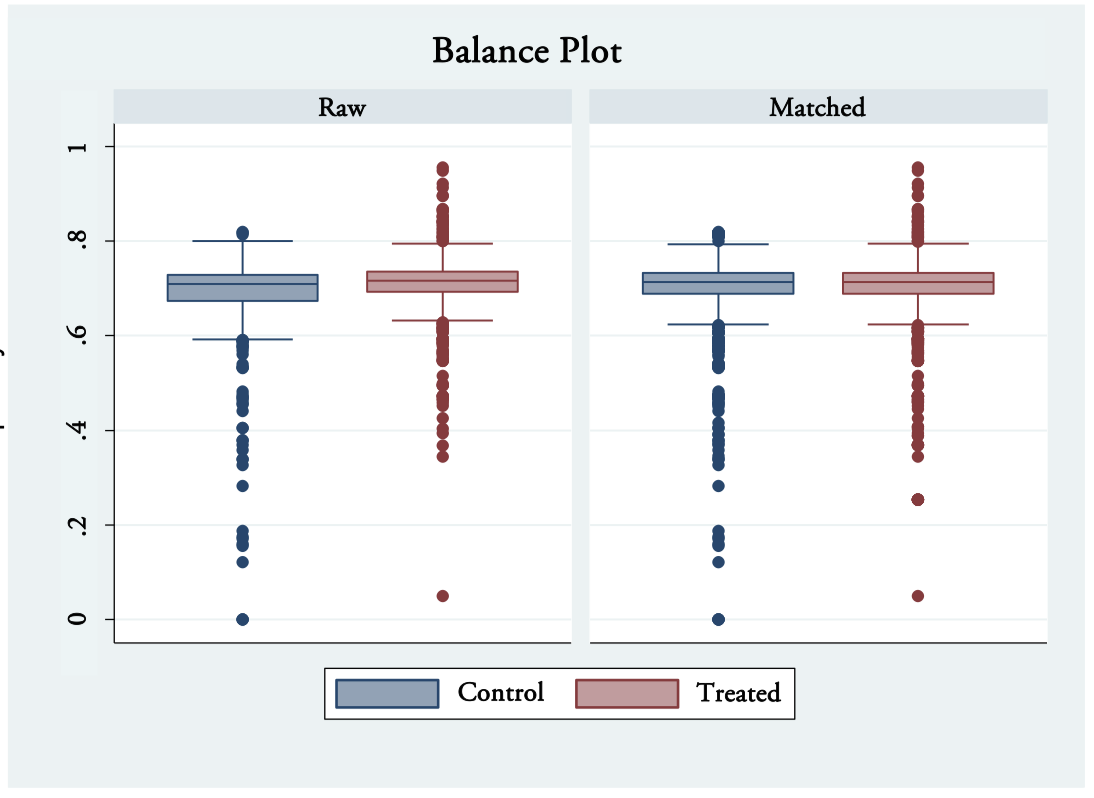 The picture in Appendix B shows the analysis of the balance among compared groups of observations. The box plots for the matched sample are similar. The medians, the 25th percentiles, and the 75th percentiles appear to be the same, although there may be some differences in the tails, the upper adjacent values, the lower adjacent values, and the outliers. Thus, this picture suggests that matching on the estimated propensity score appears to be balanced.