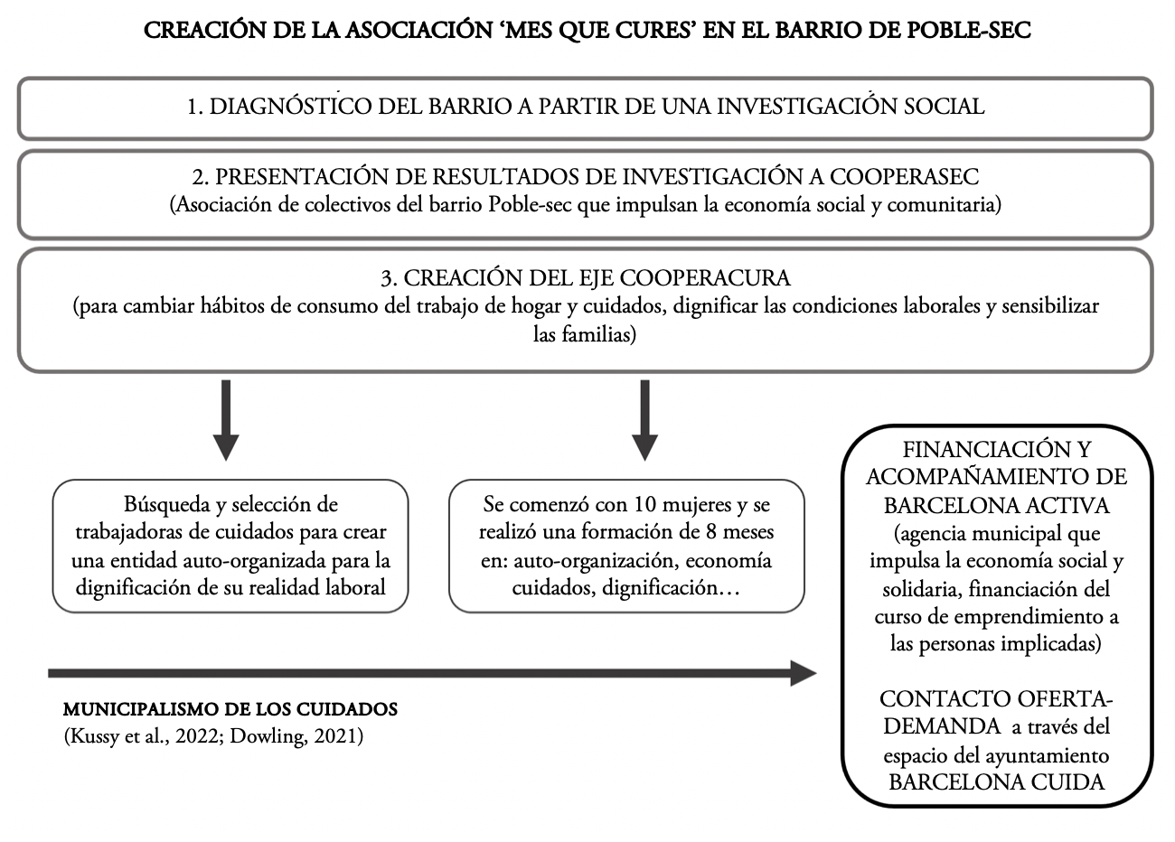 Un ejemplo pionero que hemos recopilado en nuestro trabajo de campo es el de “Més que cures” que opera en el barrio de Poble-Sec. Esta entidad tiene su origen en la “Xarxa CooperaSec”, asociación de entidades de base comunitaria de este barrio que, a partir de un diagnóstico realizado en su territorio, configura un nuevo eje destinado a la provisión de cuidados denominado “Cooperacura”. Esta agrupación inició su proceso de creación de forma autogestionada. Para ello se realizó una selección de trabajadoras de cuidados que, con el apoyo y financiación de ‘Barcelona Activa’ (agencia municipal de formación laboral y activación económica), recibieron formación y acompañamiento durante ocho meses. Así mismo, en sus dos primeros años de existencia, la organización contó con el seguimiento de la figura técnica responsable del eje de cuidados de ‘CooperaSec’. Además, el Ayuntamiento a través de la oficina “Barcelona Cuida” (punto municipal informativo de referencia sobre los recursos disponibles de cuidado) promociona y visibiliza la organización dando información a las potenciales personas usuarias (ver Figura 1).