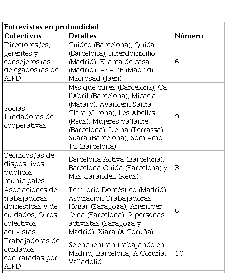 Las entrevistas en profundidad semiestructuradas se dirigieron a diversos perfiles: directores/as y gerentes de AIPD (n=6), cuidadoras remuneradas que trabajan o han trabajado a través de estas empresas (n=10), asociaciones de trabajadoras del servicio doméstico y de cuidados (n=6), fundadoras de cooperativas sin ánimo de lucro orientadas a la prestación de cuidados (n=9), y a agentes de dispositivos públicos vinculados al ámbito de los cuidados y del empleo (n=3). En el caso de las entrevistadas orientadas a las AIPD, los criterios de selección se basaron en su orientación hacia los cuidados de personas mayores en los hogares y en que su actividad encuadrase en el sector privado con ánimo de lucro. Se contactó con diez empresas, aunque sólo seis de sus gerentes se mostraron dispuestos a participar en la investigación. En cuanto a las trabajadoras, la selección se basó en personas que hubieran trabajado al menos un año y hubieran sido contratadas a través de una AIPD. La mayor parte de ellas tenían origen migrante. En el caso de las cooperativas (n=9), se seleccionaron aquellas iniciativas que habían sido configuradas a través de una relación con la administración pública, que llevaban al menos un año de funcionamiento, que tenían una voluntad transformadora y que operaban sin ánimo de lucro, estando la entrevista orientada a las personas fundadoras. Así mismo, también se recabaron los discursos de las asociaciones más representativas del trabajo de hogar y de cuidados (n=6) y de técnicos de la administración municipal que trabajan de forma directa en la gestión de entidades proveedoras de cuidados (n=3).