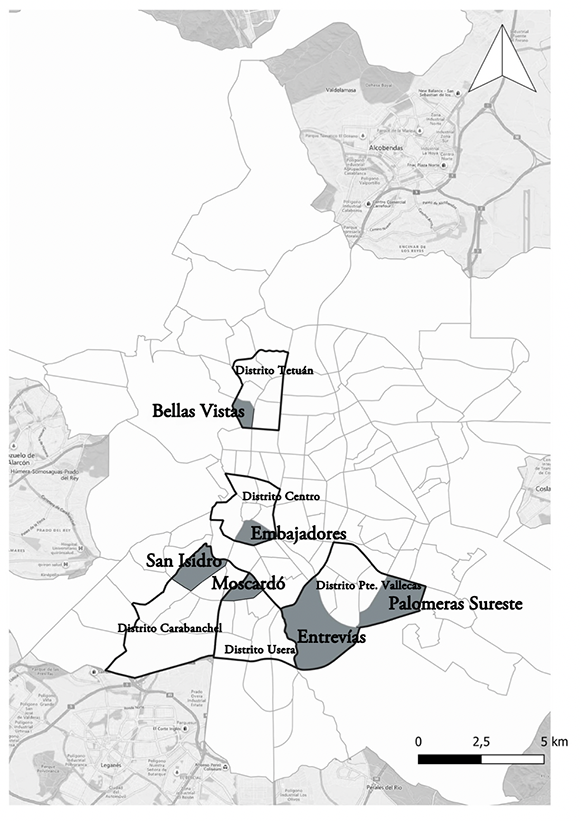 Se ha establecido la escala barrial como la unidad de análisis más adecuada, Y ello por consistir en el espacio de la vida cotidiana, vivido, percibido e imaginado (Lefebvre, 2014; Soja, 1996) al que se alude de manera prioritaria cuando se pregunta por los cuidados. La selección de barrios vulnerables de la ciudad de Madrid se ha basado en la generación de clústeres, apoyados a su vez, en tres dimensiones analíticas: el grado de vulnerabilidad, la permanencia de la población en el barrio y la intensidad de la vida barrial (Ariza, 2020). Este análisis permitió clasificar los 128 barrios del municipio madrileño en conglomerados, de los que se desecharon todos aquellos que no incluían barrios con vulnerabilidad. Se delimitaron tres clústeres con esta última característica. El primer grupo integra barrios con menor grado de vulnerabilidad (Uceda, 2016; Uceda & Domínguez, 2023) y permanencia [A10] de su población y una vida barrial media. De entre ellos, se escogieron los de Embajadores/Lavapiés, en el distrito Centro, y Bellas Vistas, en el distrito de Tetuán, por situarse ambos dentro de la almendra central madrileña. Un segundo grupo se compone de barrios con una vulnerabilidad elevada, en los que existe también una permanencia menor, pero que, al mismo tiempo, cuentan con una presencia de vida barrial importante. De entre ellos, se seleccionaron Moscardó, en el Distrito de Usera, y San Isidro, en Carabanchel. Un tercer conjunto de barrios agrupa espacios de elevada vulnerabilidad y permanencia de la población en el territorio, y con una vida barrial más intensa que los anteriores, de entre los que se seleccionaron los barrios de Entrevías y Palomeras Sureste, ambos en el distrito de Puente de Vallecas (ver mapa 1).