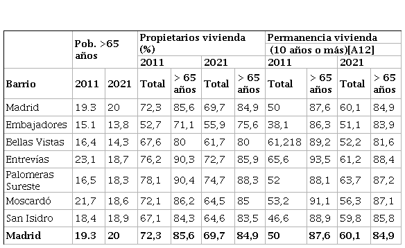 Como sucede en el conjunto de la capital, las personas mayores de 65 años constituyen un grupo relevante en casi todos los barrios vulnerables examinados. Se constata, asimismo, una distinción importante al respecto entre los barrios céntricos, antaño los más envejecidos, y los periféricos. Embajadores/Lavapiés y Bellas Vistas son así los más rejuvenecidos, hasta el punto de situarse más de casi seis puntos porcentuales por debajo de la media madrileña y lejos también de los barrios restantes aquí considerados (ver cuadro 1).