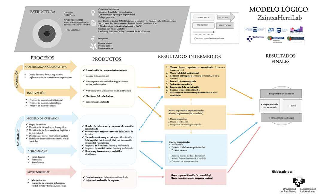 El modelo lógico que describe la intervención se compone de cinco dimensiones: estructura, procesos, productos, resultados intermedios y resultados finales. Dichas dimensiones sirven de base para guiar todo el proceso de indagación posterior y sus características principales se describen brevemente a continuación: 1) Estructura: es el marco de posibilidad en el que se enmarcan los ELC. Está compuesta por los medios o recursos financieros, humanos y organizativos que permiten activar los diferentes procesos. 2) Procesos: comprende las diferentes acciones que se realizan para conseguir los resultados. Mediante la puesta en marcha de estrategias de co-creación, los procesos derivados de la gobernanza colaborativa se conectan con procesos de innovación y los derivados en el modelo de cuidados con procesos de aprendizaje. 3) Productos: son los elementos logrados por la activación de los procesos y cristalizados en componentes concretos (por ejemplo, documentos, formaciones, herramientas y servicios). 4) Resultados intermedios: son los cambios que, con la puesta en marcha de la intervención, se pretenden conseguir en las diferentes poblaciones destinatarias (personas usuarias, familiares, personal trabajador y comunidad). 5) Resultados finales: son los beneficios finales que se pretenden conseguir para la población meta o las personas usuarias del programa, es decir, cambios duraderos que ocurren a medio o largo plazo.