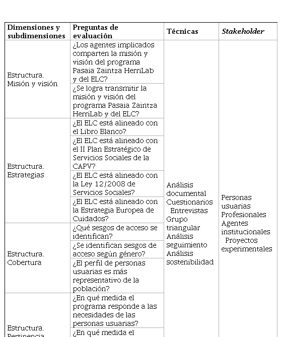 4.- Análisis de marcos interpretativos. Para analizar los indicadores relacionados con el grado de coherencia del ELC y del programa Pasaia Zaintza HerriLab con las estrategias y la normativa de referencia (la Estrategia Europea de Cuidados; la Ley 12/2008, de 5 de diciembre, de Servicios Sociales; el II Plan Estratégico de Servicios Sociales de la CAPV; y el Libro Blanco "Gipuzkoa 2030: El futuro de la atención y los cuidados en las Políticas Sociales"), se plantea un análisis de marcos interpretativos o Policy Frame Analysis, basado en la metodología utilizada por Bustelo y Lombardo (2013). Asumiendo que los marcos de política plasmados en los textos tienen un formato típico de diagnóstico y pronóstico del problema que se aborda, el análisis de marcos interpretativos trata de identificar los marcos de diagnóstico y pronóstico que operan explícita o implícitamente en los textos, comparar su lógica interna y valorar en qué puntos se distancian o aproximan entre sí. Así, se comparan los textos en ciertos puntos clave (definición del problema y cómo se representa, qué solución se ofrece, cuál es el grupo objetivo de las medidas, entre otros) para identificar los procesos de exclusión, es decir, quiénes no tienen voz en la interpretación del problema y su solución. Este proceso permite valorar el grado de coherencia entre los planteamientos plasmados en los documentos y los de la intervención objeto de la evaluación.