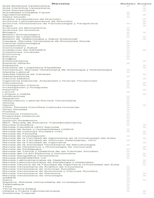 (Ríos y Herrero 2005: 49). La caída en la base de datos Scopus, a través del SJR, es indudable, de igual forma que en una base de datos regional que reúne más de 1000 revistas iberoamericanas y en la cual están incluidas 64 venezolanas, mientras en Scopus se encuentran incluidas sólo 41, como se observa en el Cuadro 1: